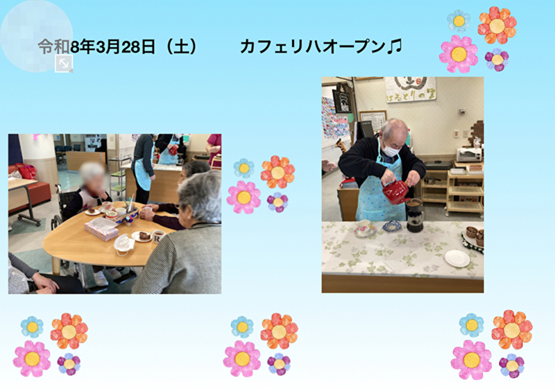 インフォメーション はるとりの里 2026/03/28カフェリハオープン♫本日、さとの喫茶改めカフェリハオープンしました😊皆さんの、生きがいやリハビリを目的としたカフェにしていきたいと思います😊皆さん、よろしくお願いします🙇 ひとつ前に戻る