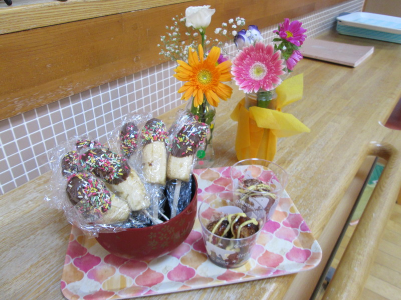 インフォメーション さくらの里 2021/10/05ひだまり NO,11こんにちは。朝晩すっかり冷え込みストーブが恋しくなる季節になりましたね。9月ひだまりユニットでは、パン屋さんでふかふかのパンを買って食べました。また、敬老会のお祝いをしました。オヤツは手作りのタコ焼きならぬエビ焼きとチョコバナナでした。どちらもおいしく頂きました。ゲームでは花すくいをして楽しみましたよ。おいしいオヤツときれいなお花、皆さん喜ばれ楽しい1日を過ごされました。 ひとつ前に戻る