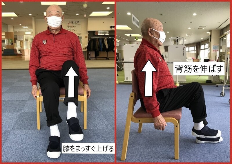 椅子にしっかり腰掛け、背筋を伸ばした姿勢で、左右交互に足を上げ下げします。