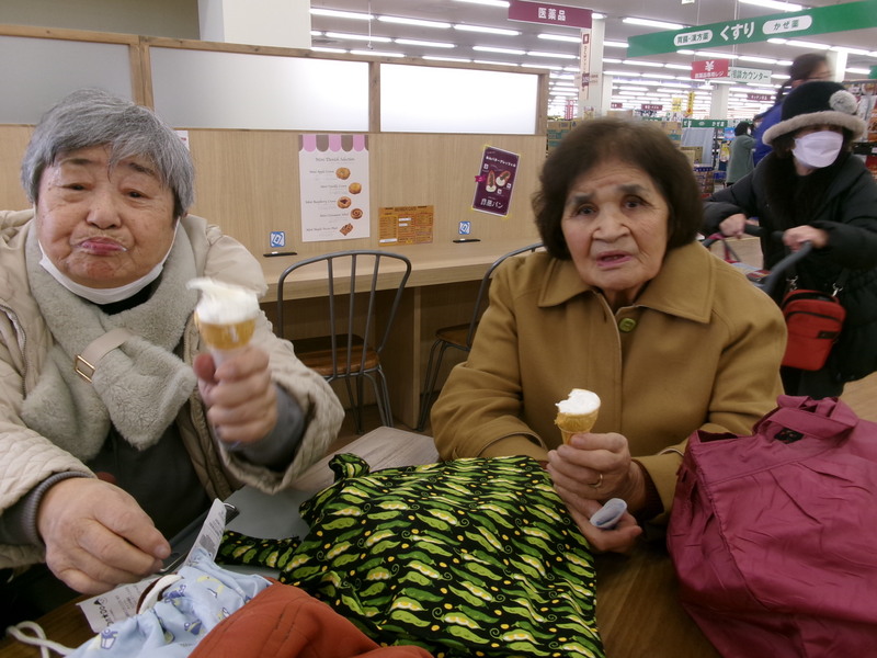インフォメーション 白樺デイサービス 2026/01/26買い物外出行事🚙今回はお客様から希望があった釧路町ホーマックに、1/19と1/26の2回に分けて買い物に出かけました🚙広い店内に時間を忘れ皆さん買い物を楽しまれ、買い物が終わった後はソフトクリームやジュース等を飲み楽しまれました✨ ひとつ前に戻る